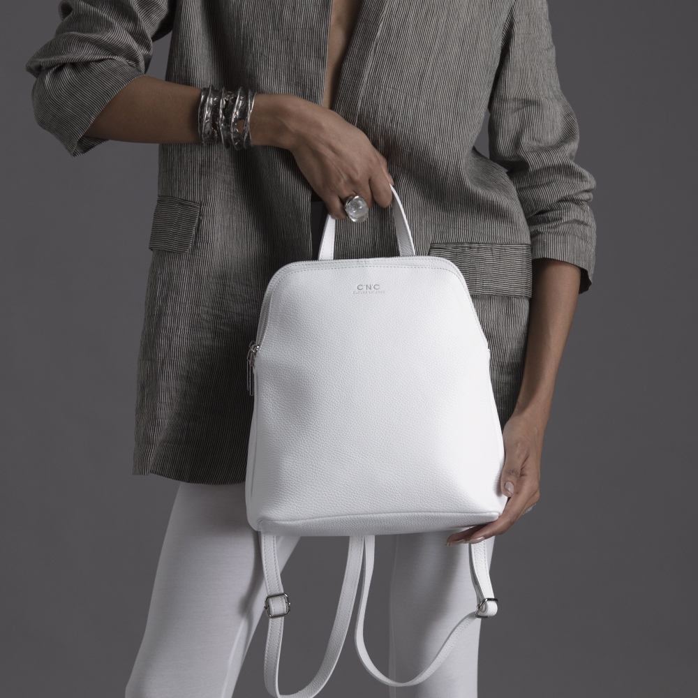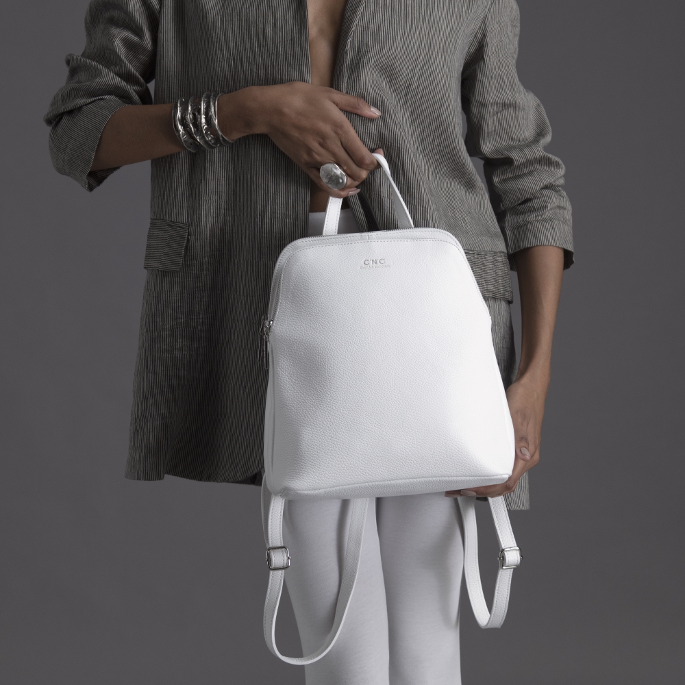 The white leather used for the backpack is high quality, smooth and soft to the touch, like calfskin or nappa. The white leather gives a fresh and sophisticated look.